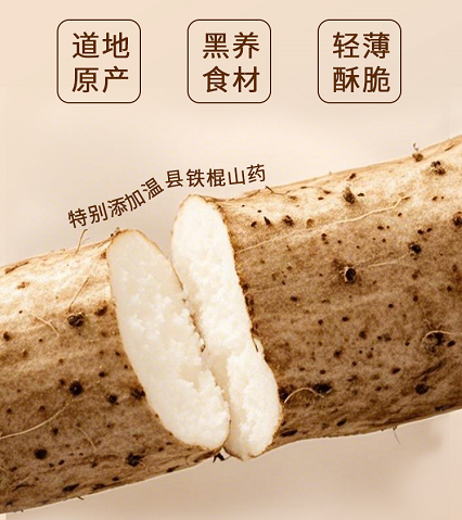 配料:温县铁棍山药(>60%)、温县小麦粉、植物油、麦芽糖、黑芝麻、温县怀地黄,黑枸杞、黑桑葚、黑豆、核桃